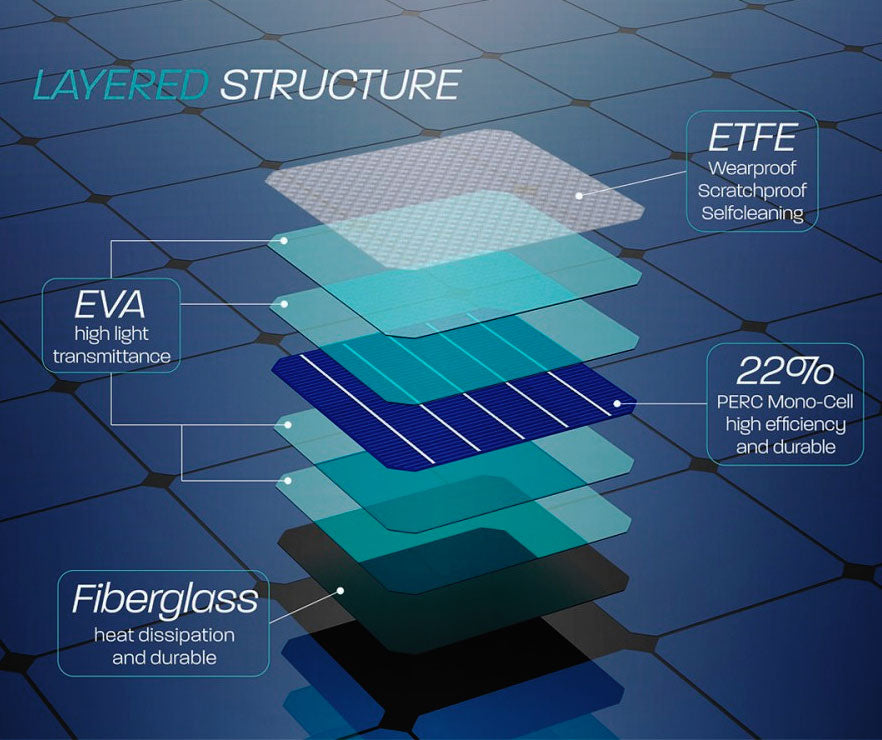 We chose the most stable and durable multilayers semi-flexible solar panel construction available to ensure that these solar panels can withstand extreme environmental conditions, maintenance-free, for years.